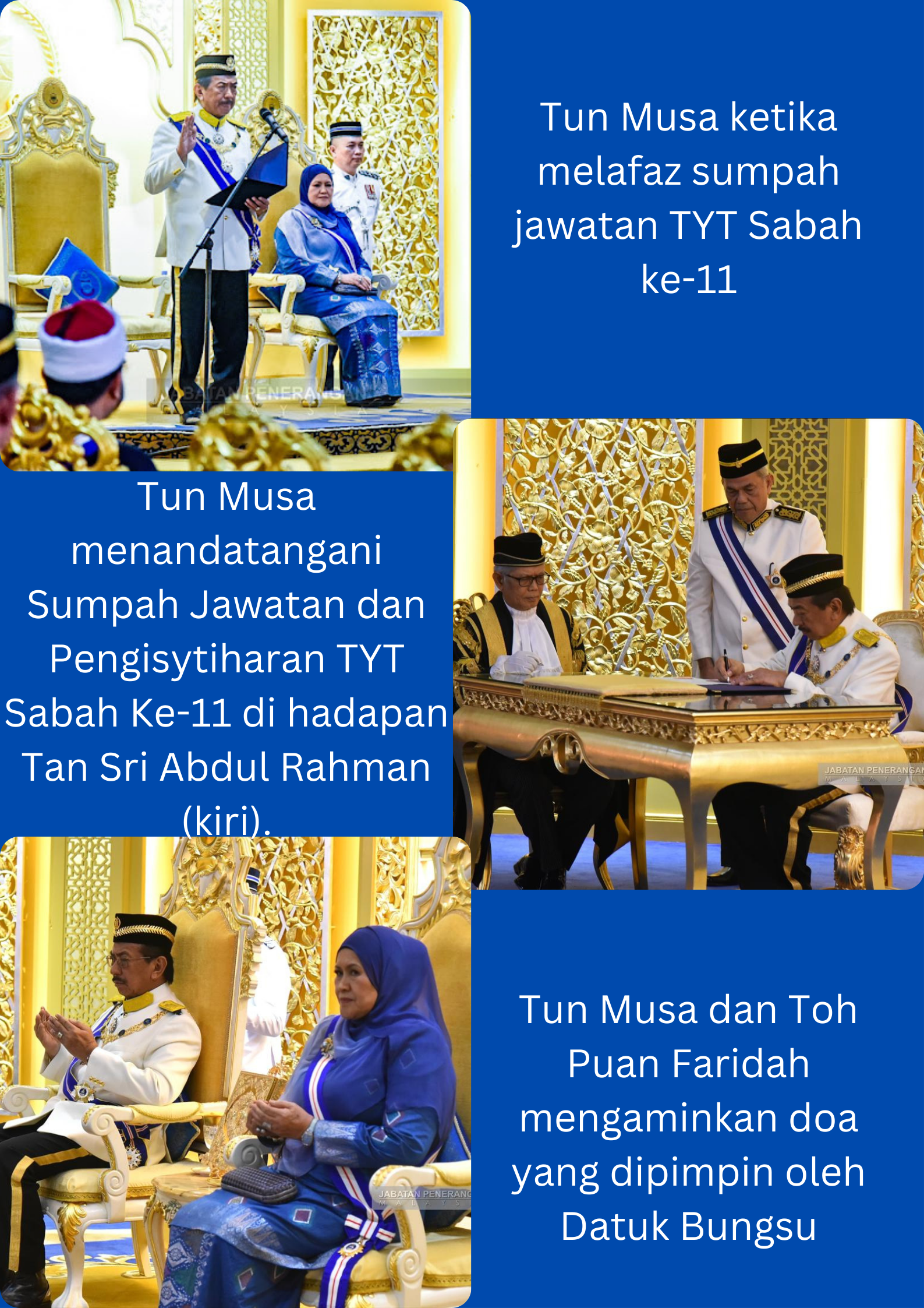 KOTA KINABALU: Tun Musa Aman melafaz sumpah sebagai Tuan Yang Terutama (TYT) Yang di-Pertua Negeri Sabah Ke-11 di Istana Seri Kinabalu, hari ini.\r\nIstiadat lafaz sumpah itu bermula sejurus ketibaan beliau bersama isteri, Toh Puan Faridah Tussin di Dewan Istiadat pada jam 10.10 pagi.\r\nDalam istiadat itu, Ketua Menteri Sabah, Datuk Seri Panglima Hajiji Noor menyempurnakan lafaz pengisytiharan Yang di-Pertua Negeri Sabah Ke-11.\r\nIa diikuti dengan lafaz sumpah jawatan sebagai Yang di-Pertua Negeri Sabah oleh Tun Musa sebelum beliau menandatangani sumpah jawatan dan pengisytiharan di hadapan Hakim Mahkamah Tinggi Sabah dan Sarawak, Tan Sri Abdul Rahman Sebli kira-kira jam 10.22 pagi.\r\nIstiadat kemudian diteruskan dengan ucapan taat setia oleh Hajiji dan disusuli bacaan doa oleh Mufti Kerajaan Negeri, Datuk Bungsu @ Aziz Jaafar.\r\nUsai istiadat berkenaan, Tun Musa dan Toh Puan Faridah beredar ke Dewan Seri Kinabalu sambil diiringi Hajiji serta isteri, Datin Seri Panglima Juliah Salag dan Speaker DUN, Datuk Seri Panglima Kadzim M. Yahya serta isteri, Datin Seri Panglima Noraini Salleh kira-kira jam 10.43 pagi.\r\nTurut mengiringi, Timbalan-timbalan Ketua Menteri, jemaah kabinet negeri, para tetamu jemputan serta isteri masing-masing.\r\nPada 17 Disember lalu, Yang di-Pertuan Agong Sultan Ibrahim berkenan mengurniakan Surat Cara Pelantikan sebagai Yang di-Pertua Negeri Sabah ke-11 kepada Tun Musa bagi menggantikan Tun Juhar Mahiruddin yang tamat tempoh perkhidmatan pada 31 Dismember 2024.\r\nBerdasarkan Perkara 1 Perlembagaan Negeri Sabah, pelantikan Tun Musa bermula 1 Januari 2025 hingga 31 Disember 2028./Penerangan-\r\nhttps://japensabah.blogspot.com/2024/12/tun-musa-melafaz-sumpah-jawatan-tyt.html