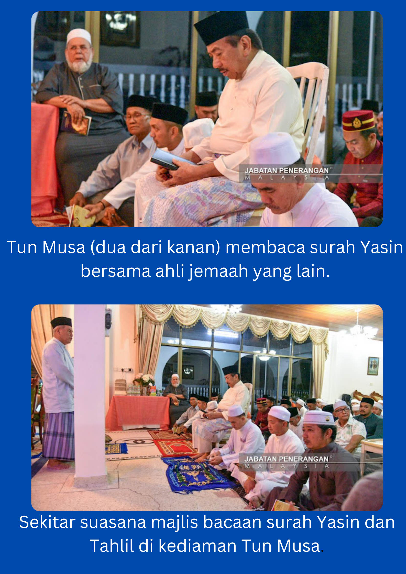 BEAUFORT : Yang di-Pertua Negeri, Tun Musa Aman menyertai Majlis Bacaan Yasin dan Tahlil bersama warga Rumah Anak Yatim Al-Aman Kampung Bingkul, pada Jumaat.\r\nMajlis dimulakan dengan menunaikan solat Maghrib secara berjemaah disusuli bacaan Surah Yasin dan tahlil dipimpin oleh Ikhwan Asgandi dari Pertubuhan Islam Seluruh Sabah (USIA). \r\nIkhwan seterusnya menyampaikan tazkirah ringkas sebelum mengimamkan solat Isyak bersama-sama 200 jemaah termasuk penduduk dari sekitar Beaufort. \r\nHadir sama, Menteri Sains Teknologi Dan Inovasi Datuk Dr Arifin Mohd Arif, Pembantu Menteri Kepada Ketua Menteri Hal Ehwal Agama Datuk Roslan Muharam, Pembantu Menteri Kerajaan Tempatan Dan Perumahan Datuk Isnin Aliasnih.\r\nhttps://japensabah.blogspot.com/2025/01/tyt-sertai-majlis-bacaan-yasin-bersama.html